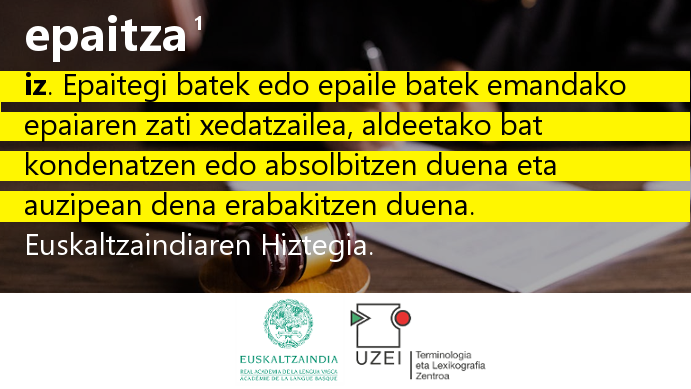 Hiztegiaren arabera, epai hitzak ‘epaile baten erabakia’ adierazten du. Auzi bati buruzko epaiak eman egiten ditu epaileak edo dagokion organoak. Hala, epaia eman esamoldea arautu du Euskaltzaindiak.