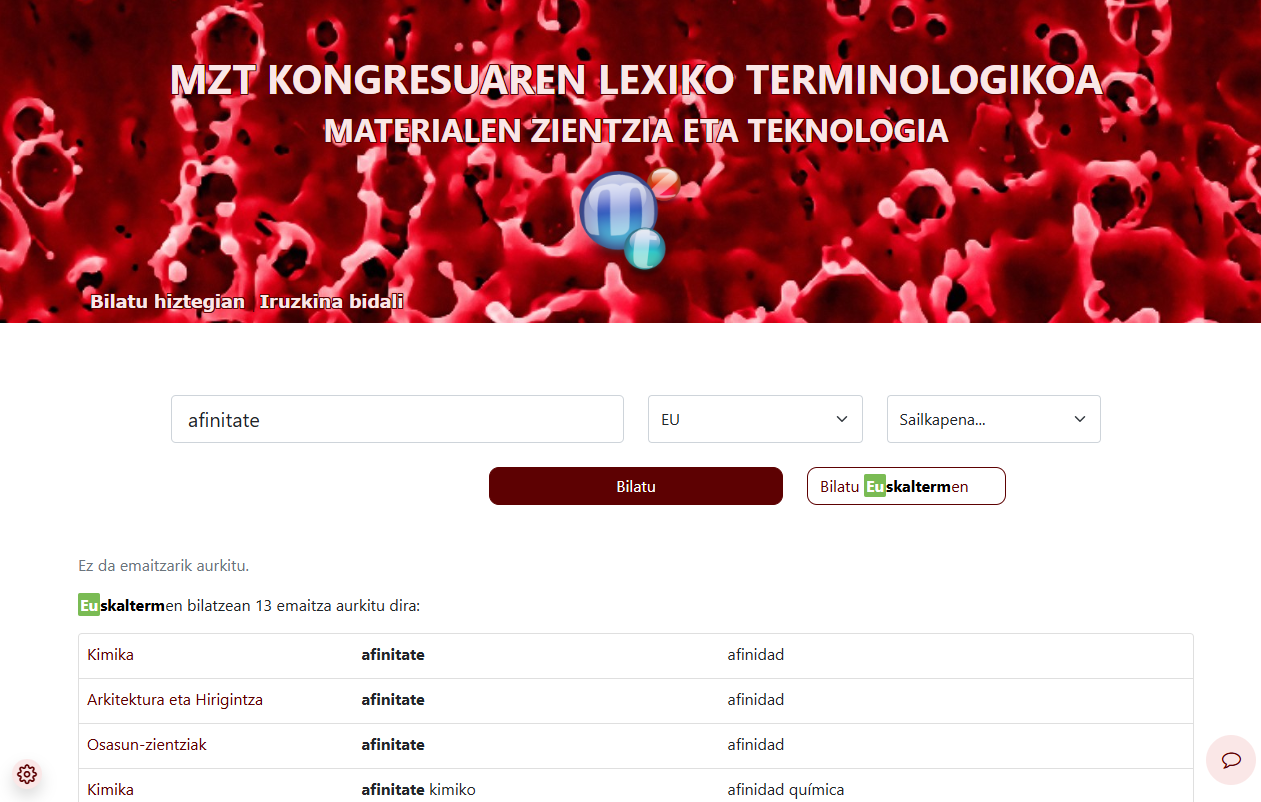 This terminology glossary (Basque-English), which contains a total of 1,379 terms from the MZT Congress, now has a new feature that allows users to search directly in Euskalterm with a single click.
